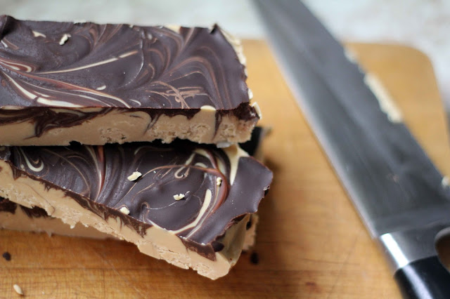 So about this Tiger Butter. It’s a simple, fudge-like sweet with only three ingredients. Creamy peanut butter is stirred into melted white chocolate and then dark chocolate is drizzled and swirled on top to make the tiger stripes. After it firms up, you slice and indulge. Rich and addictive, I guarantee it will disappear quickly. Just like the melting snow!
